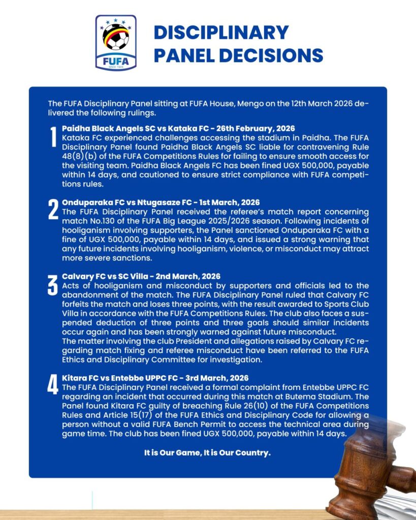 The Federation of Uganda Football Associations (FUFA) Disciplinary Panel has issued several sanctions against clubs following incidents in recent matches in the 2025/2026 season.
