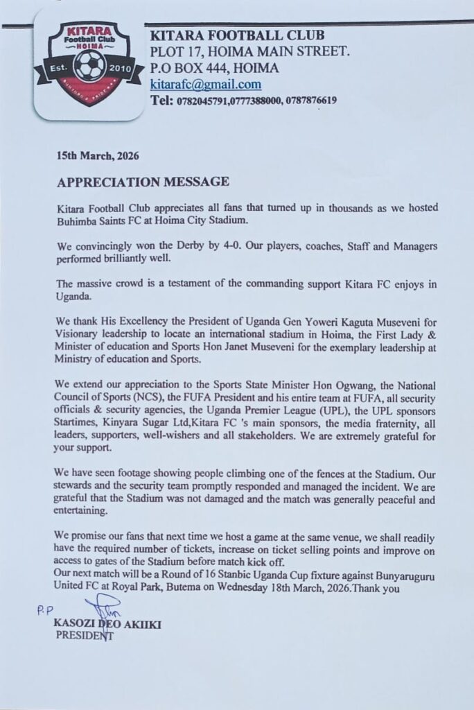 Kitara FC released an appreciation message to fans and stakeholders following an incident where supporters stormed barricades during their match against Buhimba Saints FC at Hoima City Stadium on Friday.