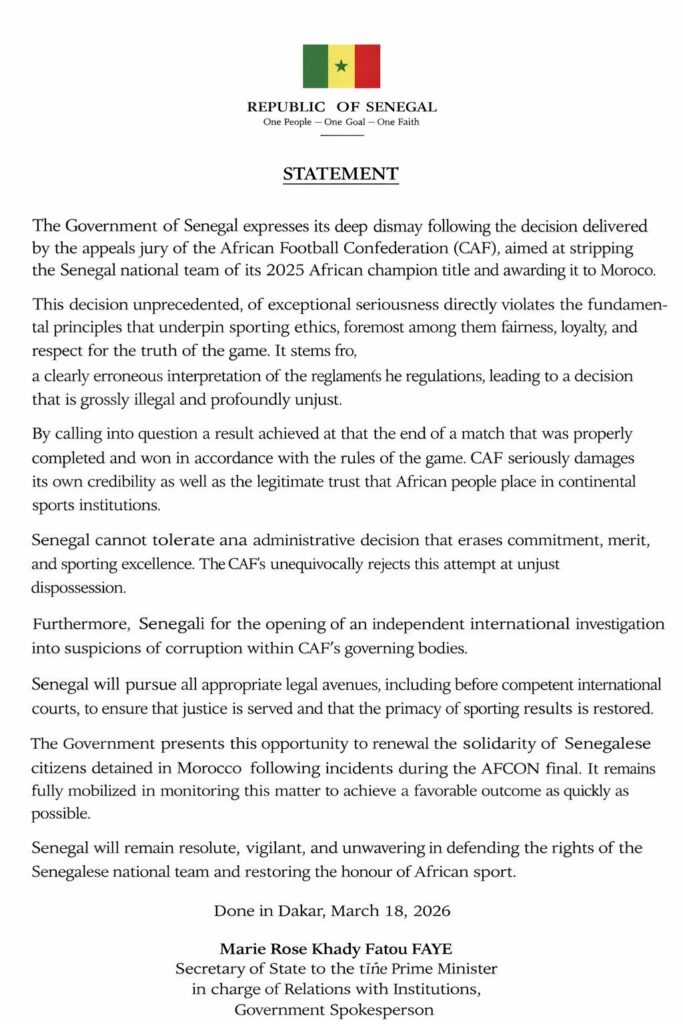 In an official statement issued in Dakar on March 18, 2026, the government expressed “deep dismay” over what it described as an unprecedented and extremely serious decision.